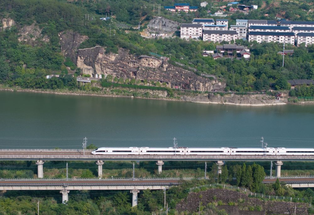 2025年7月18日,在四川省廣元市千佛崖景區(qū)對面的嘉陵江畔,一列高鐵列車運(yùn)行在西成高鐵上(無人機(jī)照片)。千佛崖腳下的金牛古蜀道和對岸的高鐵列車,濃縮成一幅千年蜀道變遷圖。