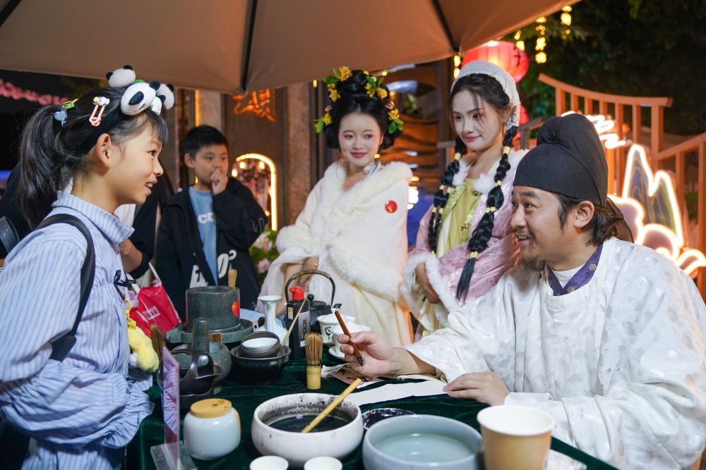 2024年10月4日,在四川省成都市東門碼頭夜游錦江項目推出的“錦夜慶華誕·璀璨耀蓉城”國慶系列主題活動上,“李白”(右)與小朋友互動對詩。