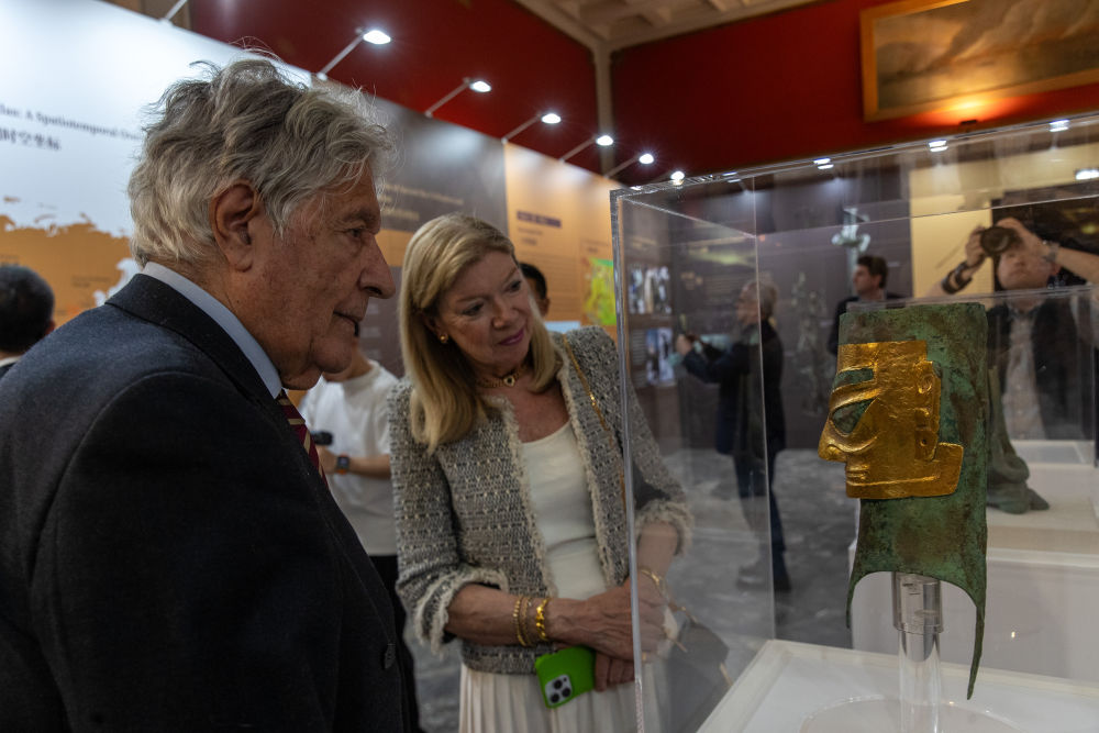 2025年5月13日,觀眾在希臘雅典新斯米爾尼市政博物館參觀“青銅之光——古蜀文明特展”。展覽通過精美的文物復(fù)制品、3D打印技術(shù)和圖文展示,生動呈現(xiàn)以三星堆—金沙遺址為代表的古蜀文明,吸引眾多當(dāng)?shù)孛癖娗皝韰⒂^。