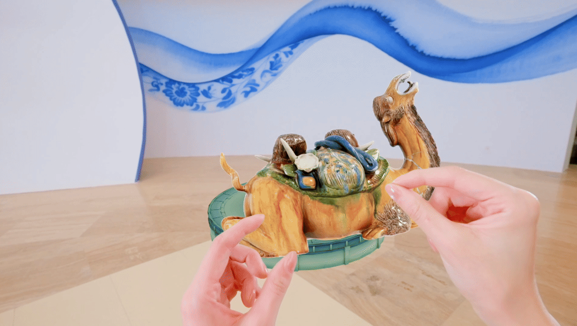 “像這個唐三彩載物臥駝俑,制作惟妙惟肖,能夠讓觀眾了解古絲綢之路商貿(mào)情況。唐三彩載物臥駝俑放在展柜里,背面部分觀眾不易看到?,F(xiàn)在通過MR(混合現(xiàn)實)眼鏡,觀眾就可以全方位查看這件文物的各處細節(jié)?!蔽靼膊┪镌簲?shù)字與信息部工作人員李源介紹道。