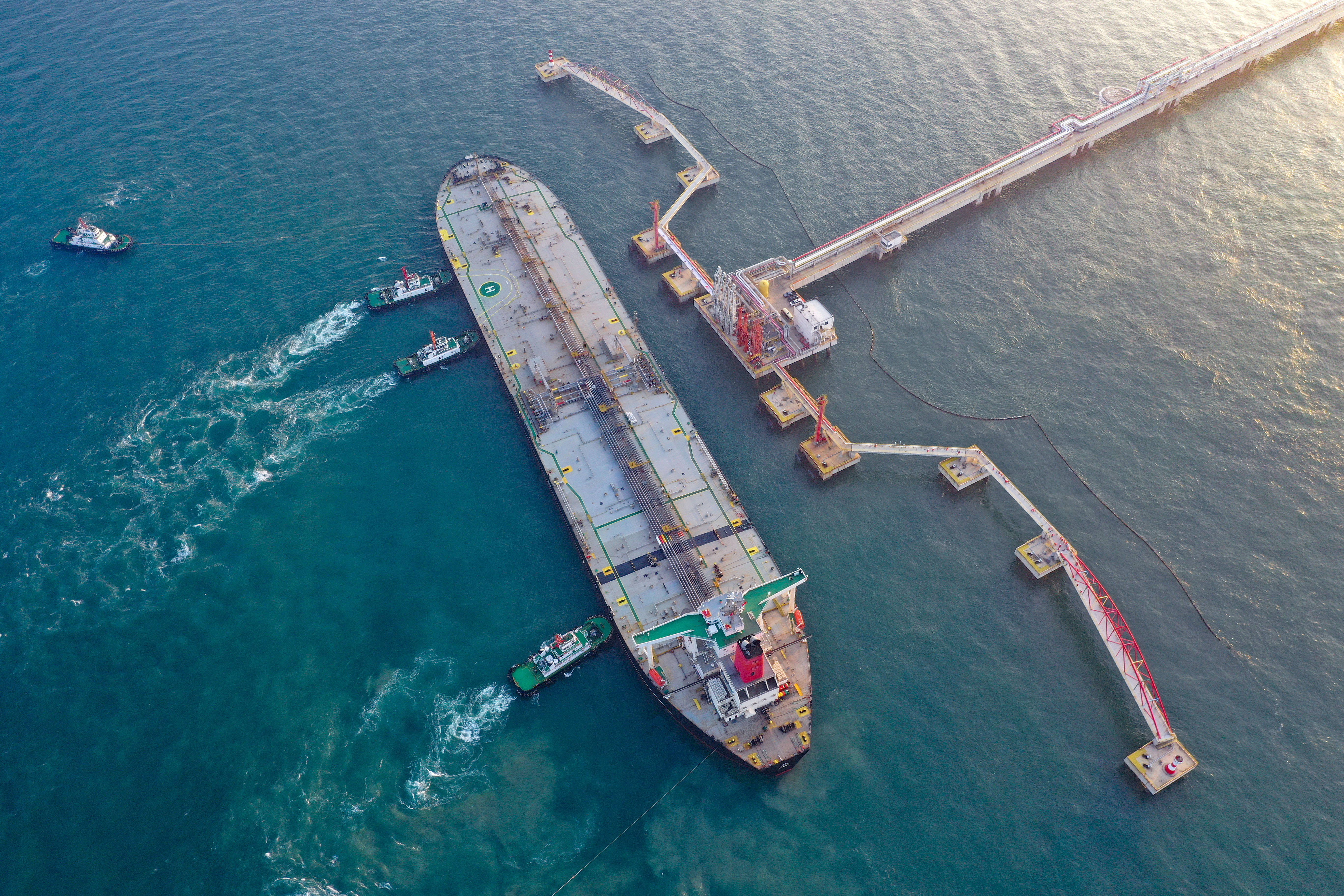 2025年12月18日,一艘裝載著17.9萬噸石化原輔料的船舶泊入位于海南省儋州市的國投洋浦油儲碼頭30萬噸級原油泊位(無人機(jī)照片)。