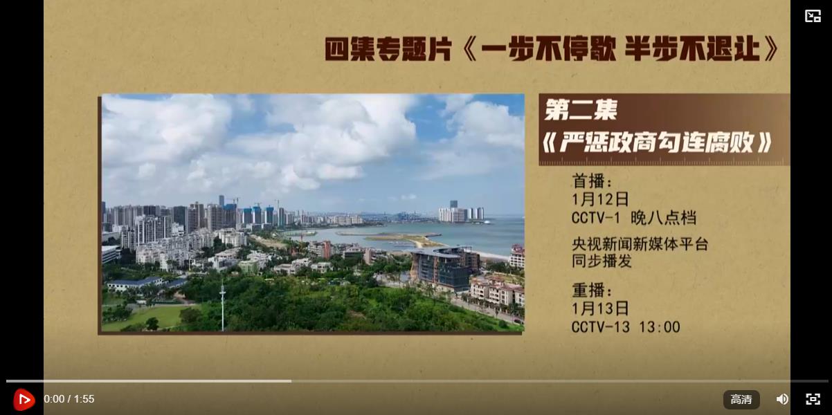 反對腐敗、建設(shè)廉潔政治,是我們黨一貫堅持的鮮明政治立場,是黨自我革命必須長期抓好的重大政治任務(wù)。要把嚴(yán)懲政商勾連腐敗作為攻堅戰(zhàn)重中之重,堅決打擊以權(quán)力為依托的資本逐利行為,堅決防止各種利益集團(tuán)、權(quán)勢團(tuán)體向政治領(lǐng)域滲透,不斷凈化政治生態(tài),推動構(gòu)建親清統(tǒng)一的新型政商關(guān)系,促進(jìn)經(jīng)濟(jì)社會高質(zhì)量發(fā)展。電視專題片《一步不停歇半步不退讓》第二集《嚴(yán)懲政商勾連腐敗》,講述紀(jì)檢監(jiān)察機(jī)關(guān)聚焦政治問題和經(jīng)濟(jì)問題交織的腐敗案件,嚴(yán)懲以商養(yǎng)官、以官護(hù)商、官商一體等問題,堅決破除政商勾連“利益共同體”??偱_央視綜合頻道1月12日晚8點(diǎn)檔播出,央視新聞新媒體平臺同步播發(fā)。