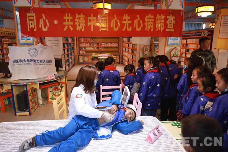 北京天壇醫(yī)院心臟外科馬浩在為當(dāng)?shù)貙W(xué)生聽(tīng)診