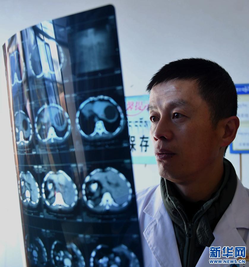 圖為西藏自治區(qū)第二人民醫(yī)院醫(yī)生張慶達在查看包蟲病患者CT片(2017年11月14日攝)。新華社記者晉美多吉 攝