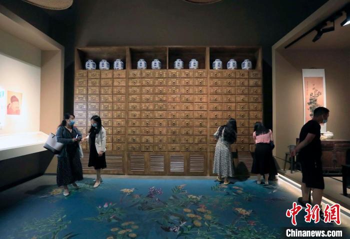 觀眾在觀看展出的中醫(yī)藥房?!⊥趵?攝