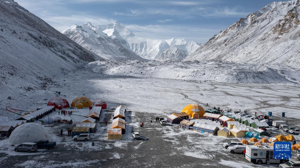 這是珠峰登山大本營(yíng)(5月1日攝,無(wú)人機(jī)照片)。新華社記者 孫非 攝