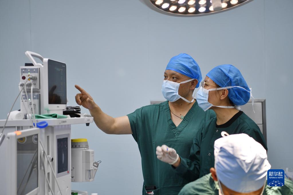 7月31日,在阿里地區(qū)人民醫(yī)院手術室,西藏自治區(qū)人民醫(yī)院麻醉科醫(yī)生達娃吾珠(左一)指導當?shù)芈樽磲t(yī)生旦增次白進行麻醉監(jiān)測。新華社記者 張汝鋒 攝