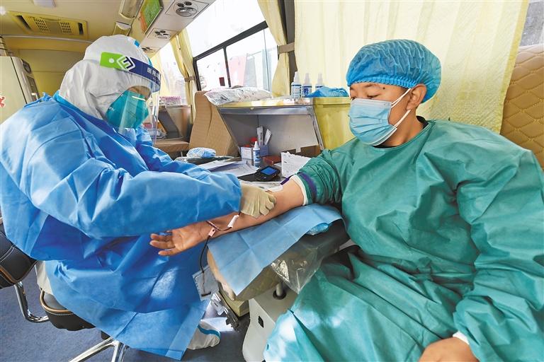 近日,西藏自治區(qū)無償獻血委員會向全區(qū)各級黨政機關、企事業(yè)單位、民間社會組織和社會各界愛心人士發(fā)出《致全區(qū)人民無償獻血倡議書》, 西藏各族各界干部群眾積極響應,踴躍參與無償獻血,奉獻愛心,傳遞正能量。 圖為醫(yī)護人員在采集血液。 記者 唐斌 攝