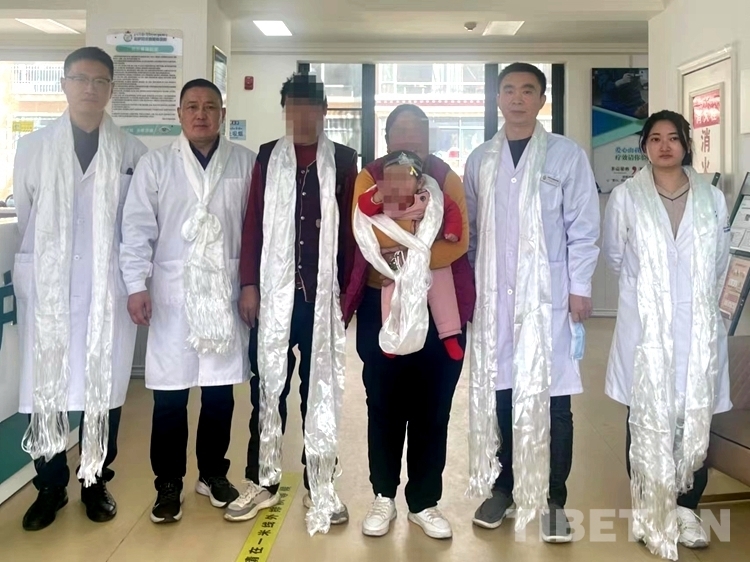 圖為醫(yī)療團隊醫(yī)生與才巴央措及她的父母合影
