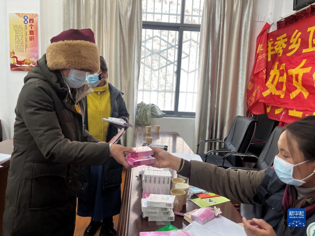 西藏那曲市比如縣羊秀鄉(xiāng)衛(wèi)生院醫(yī)生在給當?shù)乩习傩瞻l(fā)放藥品。(資料圖片)