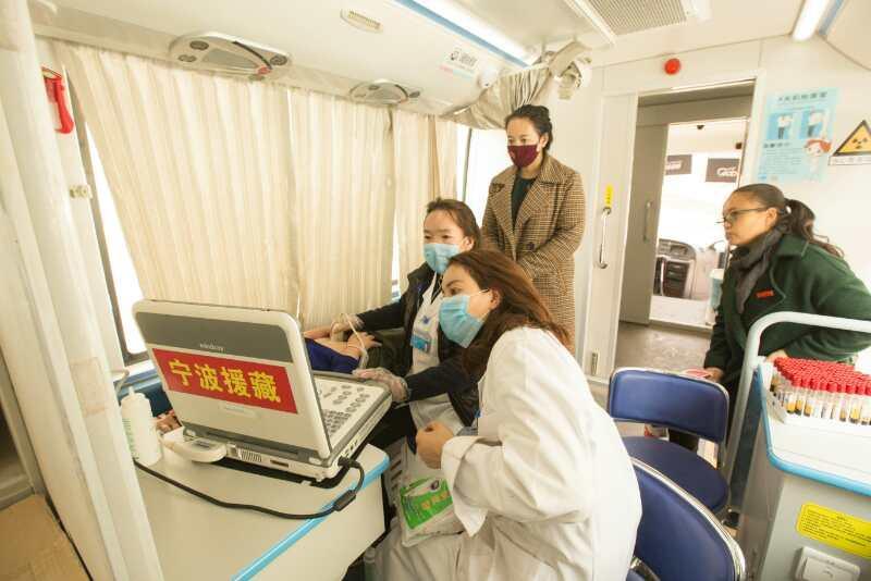 一輛八米多長的農(nóng)牧民健康體檢車按照年度計劃,穿梭于比如縣的大小鄉(xiāng)村。車上載有先進的DR(數(shù)字影像攝片機)、便攜彩超機、心電圖機、便攜檢驗設備。這臺車是浙江省援藏副指揮長、比如縣委常務副書記盛悠聯(lián)系寧波市江北區(qū)政府捐贈的。在第八批寧波紹興援藏工作組干部的精心設計下,專門向宇通公司定制的一輛功能齊全的大巴體檢車,光車底和改裝費用就達73萬元。它與普通體檢車需要接入停泊地市電、自來水才能運行不同,寧波的援藏干部根據(jù)西藏鄉(xiāng)村缺電少水的現(xiàn)狀,多方咨詢方案,最后增加了價值十萬元的高壓電容設備,實現(xiàn)了通過車載的小型發(fā)電機帶動50千瓦的DR,并可連續(xù)運轉(zhuǎn),這在全國尚屬首例。車上還配備主動式抽水泵,解決上水問題,并配有空調(diào)系統(tǒng)。車子開到哪里,便可不靠外力,進行包括拍攝X光片、彩超、心電、檢驗等的全面健康體檢,許多鄉(xiāng)鎮(zhèn)衛(wèi)生院也不如這輛體檢車的配置強大。