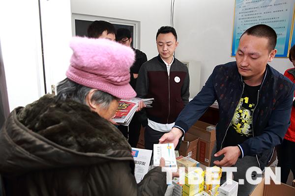 圖為志愿者為村民發(fā)放藥品。