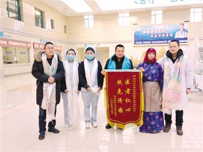 受到那曲惠民醫(yī)院救助的安多縣牧民美朵拉姆(右二)為醫(yī)院送來(lái)錦旗。 謝偉 王曉莉 攝