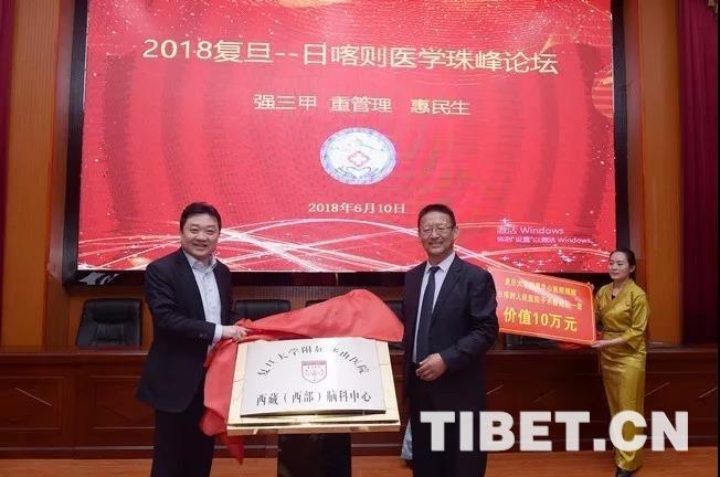 圖為復(fù)旦-日喀則醫(yī)學高峰論壇上,復(fù)旦大學附屬華山醫(yī)院副院長毛穎與日喀則市人民醫(yī)院院長米瑪多吉一同為腦科疾病診療中心揭牌。日喀則市人民醫(yī)院供圖