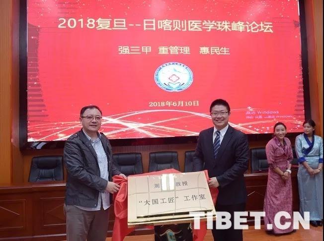 圖為復(fù)旦-日喀則醫(yī)學高峰論壇上,日喀則市人民醫(yī)院龍子雯與周平紅教授一同為周平紅-大國工匠工作室掛牌。日喀則市人民醫(yī)院供圖