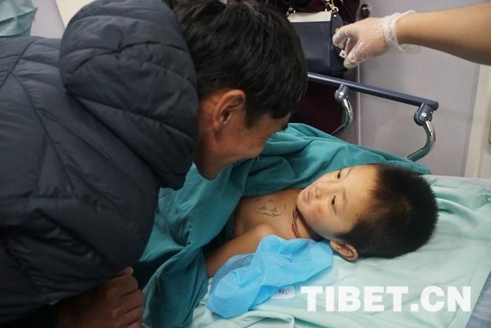 圖為手術(shù)結(jié)束后,丁子扎西問兒子“疼不疼”。 攝影:孫健