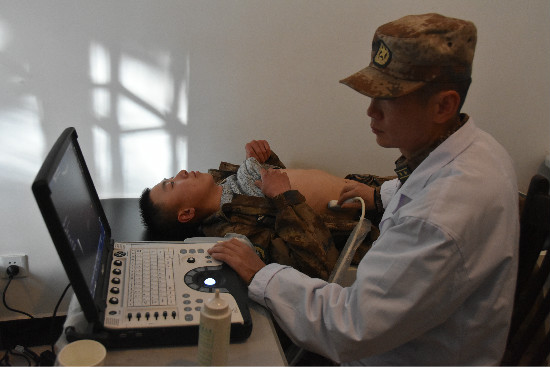 聽(tīng)說(shuō)陸軍九五六醫(yī)院前來(lái)巡診,官兵們?cè)缫训群蛟陂T(mén)外。查體、量血壓、做彩超……醫(yī)療隊(duì)員們耐心地詢問(wèn)官兵的身體狀況,為每個(gè)官兵做詳細(xì)的體檢。