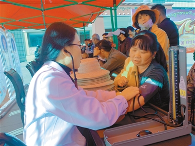 近日,由西藏林芝市人民醫(yī)院的醫(yī)護人員組成的志愿者服務(wù)隊,走進林芝市巴宜區(qū)為群眾送醫(yī)送藥送健康,把關(guān)懷送到群眾心中。圖為林芝市人民醫(yī)院醫(yī)護人員在巴宜區(qū)廈門廣場為群眾測量血壓。記者 張猛 史金茹 攝