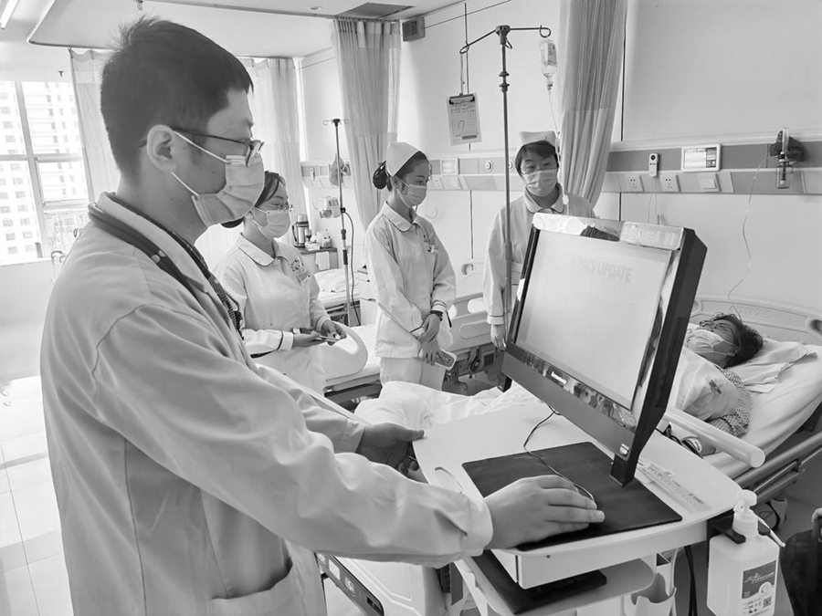 西寧市第一醫(yī)療集團(tuán)總院醫(yī)生運(yùn)用移動(dòng)工作站為患者服務(wù)。