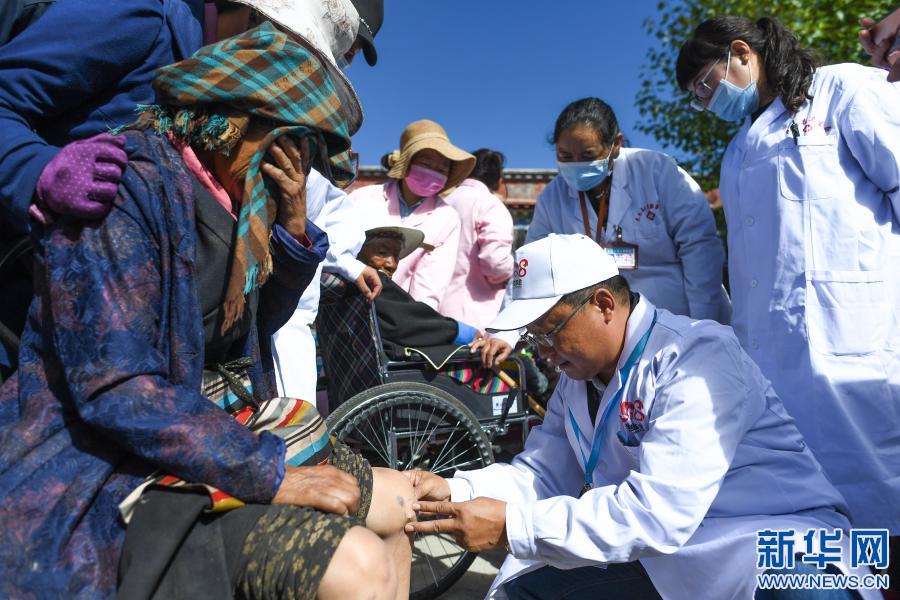在健康扶貧西藏尼木行公益活動上,中醫(yī)大夫任志剛在拉薩市尼木縣福利院為老人診治(2017年9月17日攝)。新華社記者 普布扎西 攝