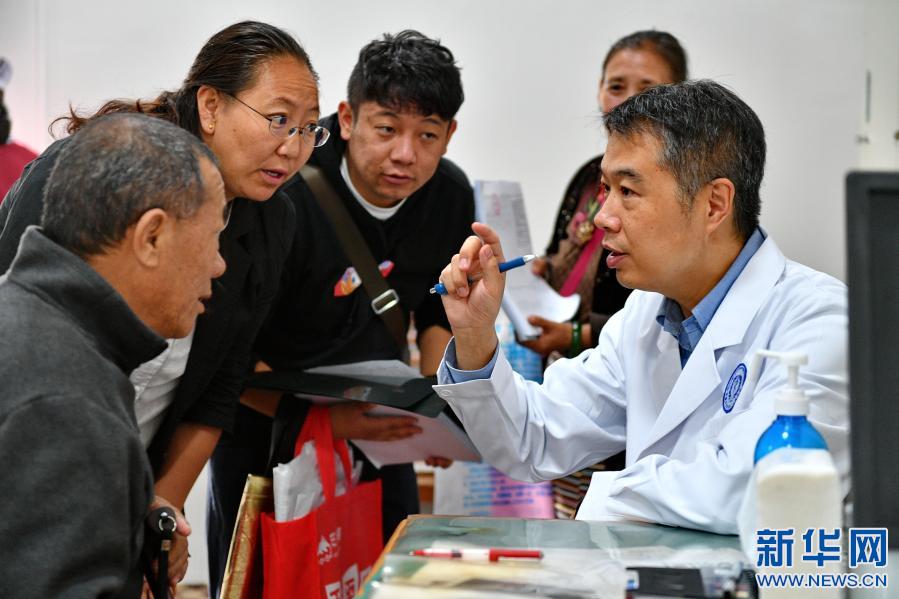 在西藏自治區(qū)第二人民醫(yī)院,首都醫(yī)科大學附屬北京天壇醫(yī)院神經(jīng)外科主任醫(yī)師曹勇(右一)為患者(左一)診?。?019年8月31日攝)。新華社記者 張汝鋒 攝
