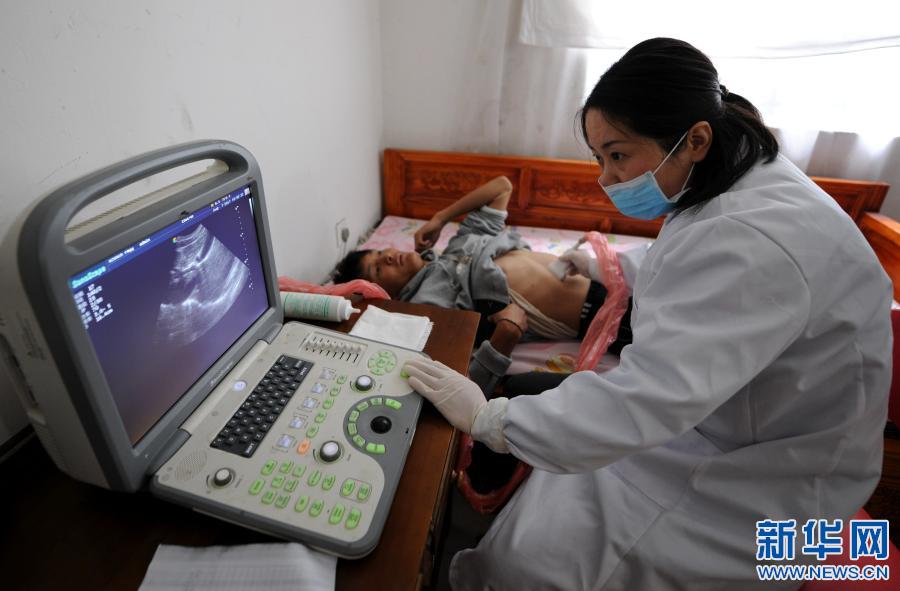 安徽省援藏醫(yī)療人員在西藏山南市錯那縣勒門巴民族鄉(xiāng)為當?shù)卮迕馚超檢查腹腔,進行包蟲病篩查(2017年8月7日攝)。新華社記者 晉美多吉 攝