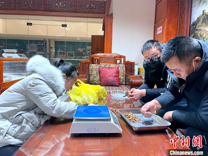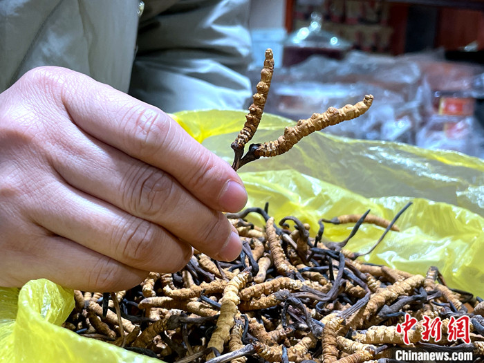 圖為商家為客戶(hù)挑選冬蟲(chóng)夏草。中新社記者 孫睿 攝