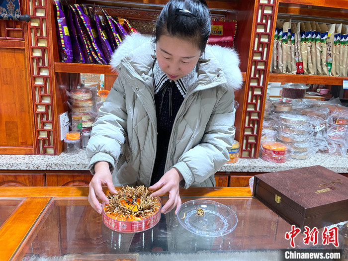 圖為商家將冬蟲(chóng)夏草擺放在禮盒中。中新社記者 孫睿 攝