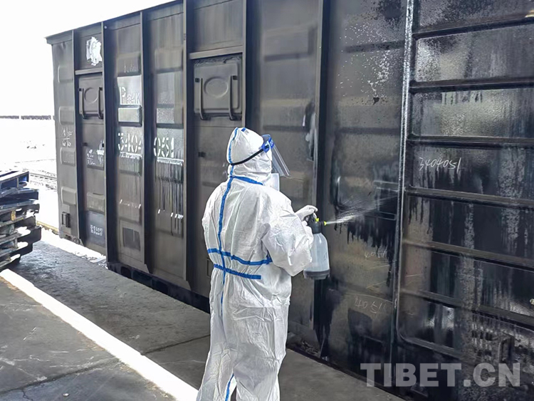 圖為拉薩車務段工作人員對到站物資進行消殺