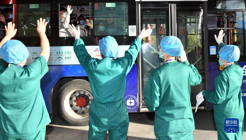 8月21日,拉薩方艙醫(yī)院的醫(yī)護人員向出艙患者揮手告別。新華社記者 覺果 攝