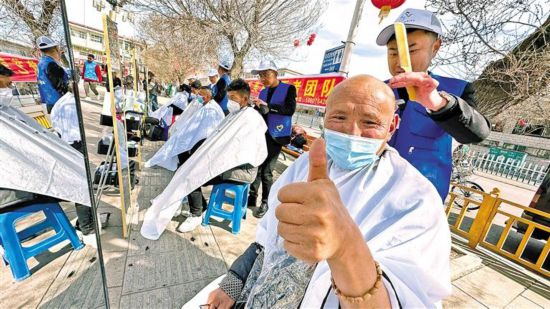 在拉薩市開展的“ 民族團結(jié)一家 巧手剪出民族情”愛心義剪志愿服務(wù)活動中,理發(fā)師們?yōu)楦髯迦罕娎戆l(fā)。記者 格桑倫珠 唐斌 攝