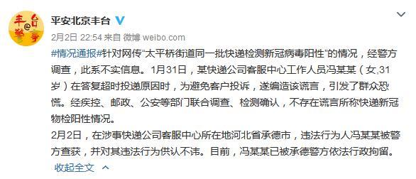 據(jù)北京豐臺(tái)公安分局官方微博消息,針對(duì)網(wǎng)上流傳“太平橋街道同一批快遞檢測(cè)新冠病毒陽(yáng)性”的情況,經(jīng)警方調(diào)查,此系不實(shí)信息。1月31日,某快遞公司客服中心工作人員馮某某(女,31歲)在答復(fù)超時(shí)投遞原因時(shí),為避免客戶(hù)投訴,遂編造該謊言,引發(fā)了群眾恐慌。經(jīng)疾控、郵政、公安等部門(mén)聯(lián)合調(diào)查、檢測(cè)確認(rèn),不存在謊言所稱(chēng)快遞新冠物檢陽(yáng)性情況。