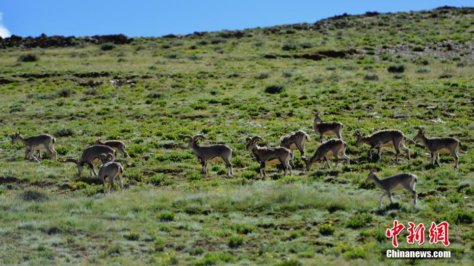 9月2日,多只藏原羚和巖羊在西藏山南羊卓雍錯(cuò)湖畔覓食。當(dāng)?shù)亟陙聿粩嗉哟蟊Wo(hù)力度,環(huán)境日益趨好,野生動(dòng)物種群正在逐漸恢復(fù)、增長。中新社記者 江飛波 攝