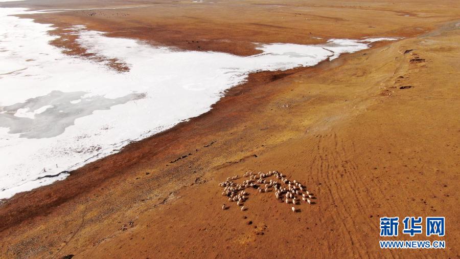 12月17日,羊群走在被冰雪覆蓋的青海湖湖畔(無(wú)人機(jī)照片)。新華社記者 張宏祥 攝