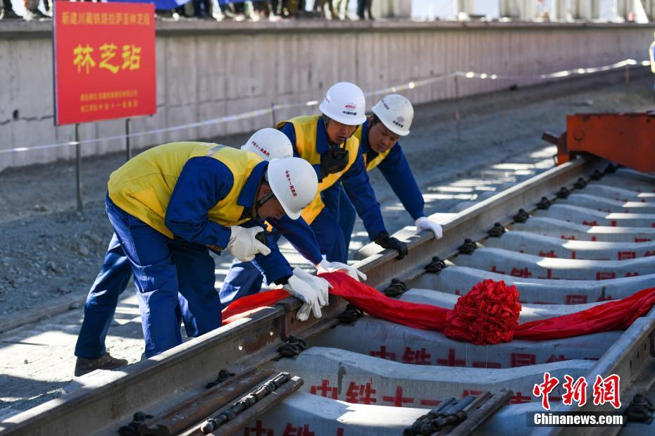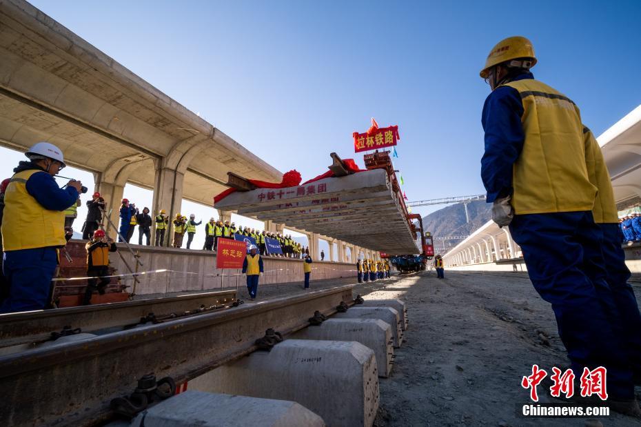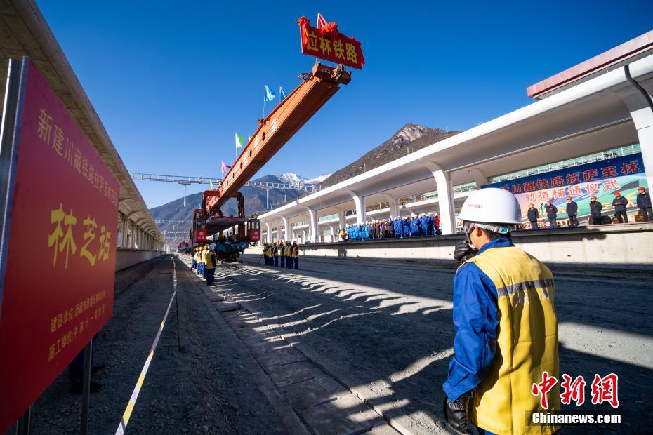 12月31日,拉林鐵路最后一段軌排鋪設(shè)現(xiàn)場。當(dāng)日,在西藏林芝市尼洋河畔的新建林芝火車站,川藏鐵路拉薩至林芝段(拉林鐵路)最后一段軌排順利鋪設(shè),這標(biāo)志著拉林鐵路399.61公里的正線軌道全部鋪通,西藏東南地區(qū)結(jié)束無鐵路歷史。拉林鐵路起自西藏自治區(qū)首府拉薩,終點(diǎn)為林芝市,正線全長435.5公里,新建正線403.1公里,系西藏首條電氣化鐵路,設(shè)計(jì)行車速度為160km/h,全線計(jì)劃于2021年6月30日建成通車。中新社記者 何蓬磊 攝