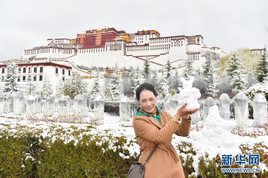 3月14日,在布達拉宮前,一名路人舉起一個雪人留影。
