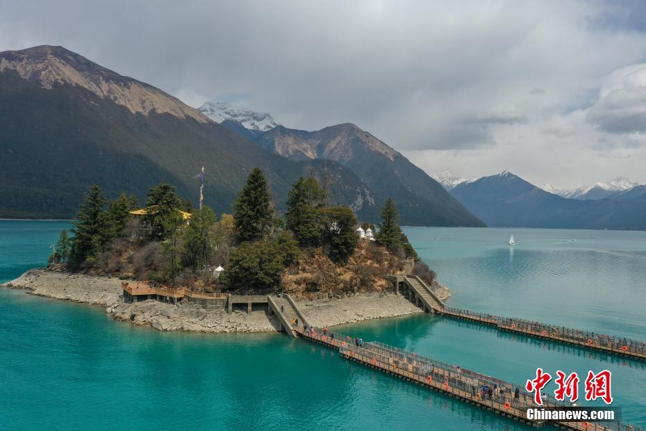 巴松措位于西藏林芝,湖面海拔3480米,是西藏海拔最低的大湖。湖水呈碧綠色,清澈透亮,四周環(huán)繞的雪山和樹木倒映其中,美不勝收。圖為3月29日,游客在扎西島游玩。(無人機拍攝)中新社發(fā) 貢嘎來松 攝