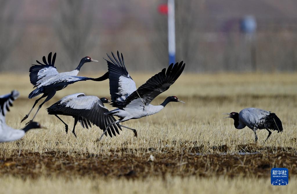 黑頸鶴在拉薩市林周縣農田里起舞(1月8日攝)。新華社記者 張汝鋒 攝