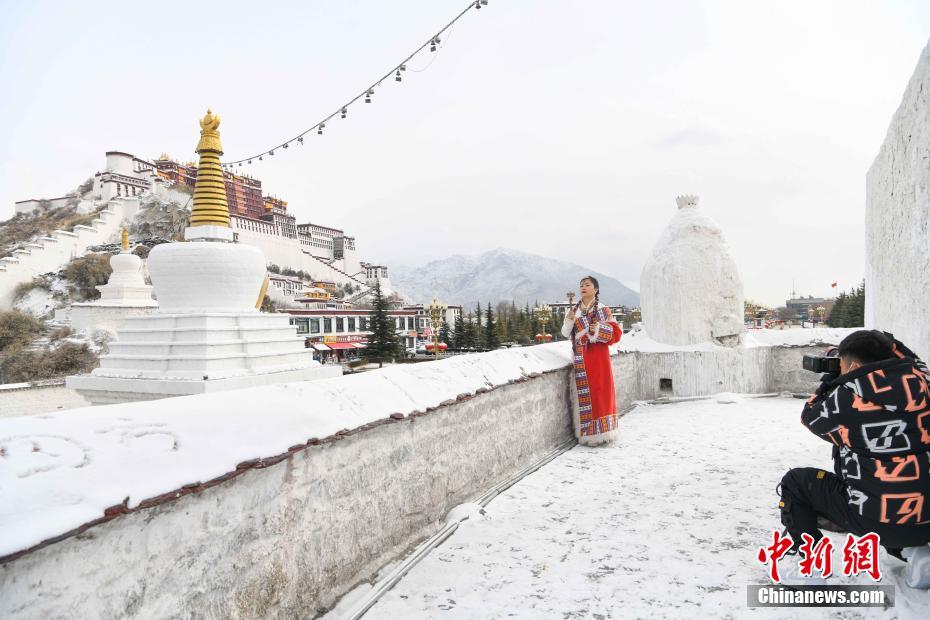 2月21日,游客穿著藏族傳統(tǒng)服飾在布達拉宮拍照留念。當日,西藏拉薩市迎來降雪,雪后的拉薩城區(qū)和周圍群山白雪皚皚,風景如畫。 中新社記者 貢嘎來松 攝