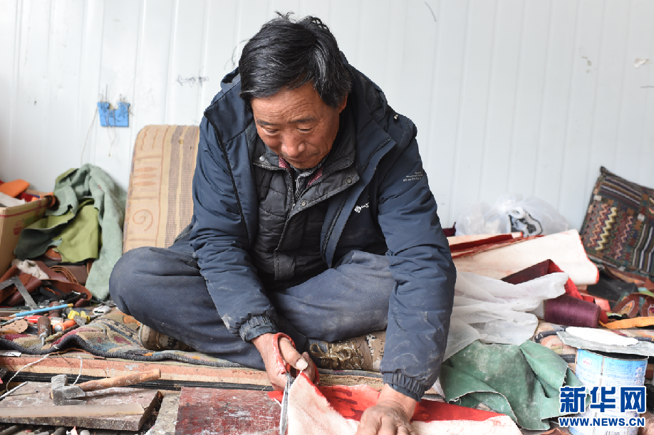 2月24日,曲水俊巴民族手工皮具制作傳承人次仁在制作皮具。新華網 旦增努布 攝