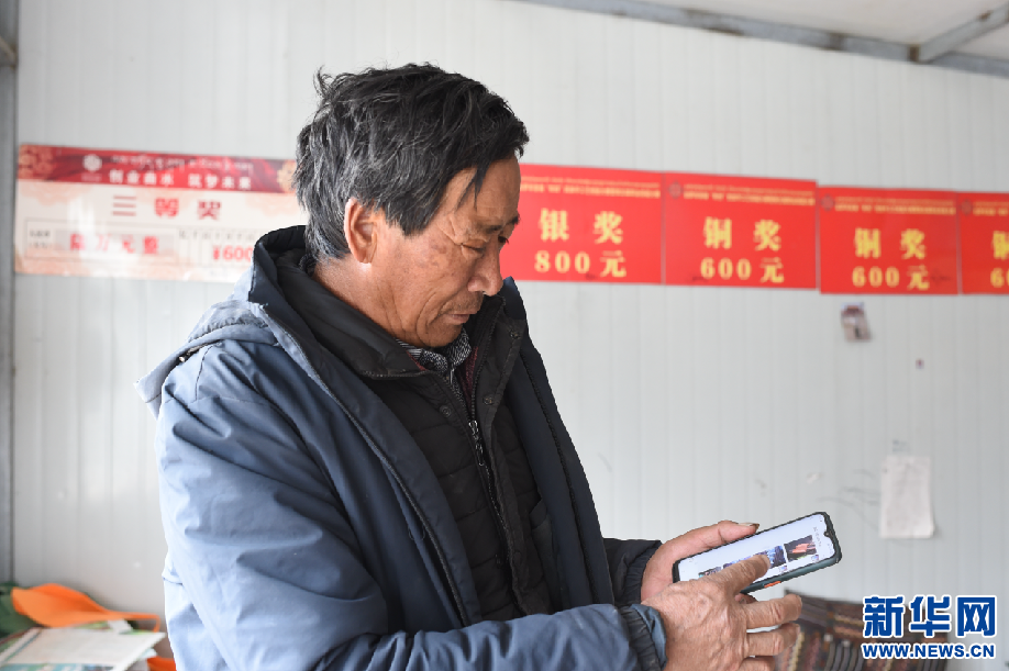 2月24日,曲水俊巴民族手工皮具制作傳承人次仁通過手機上網為客戶介紹皮具產品。新華網 旦增努布 攝