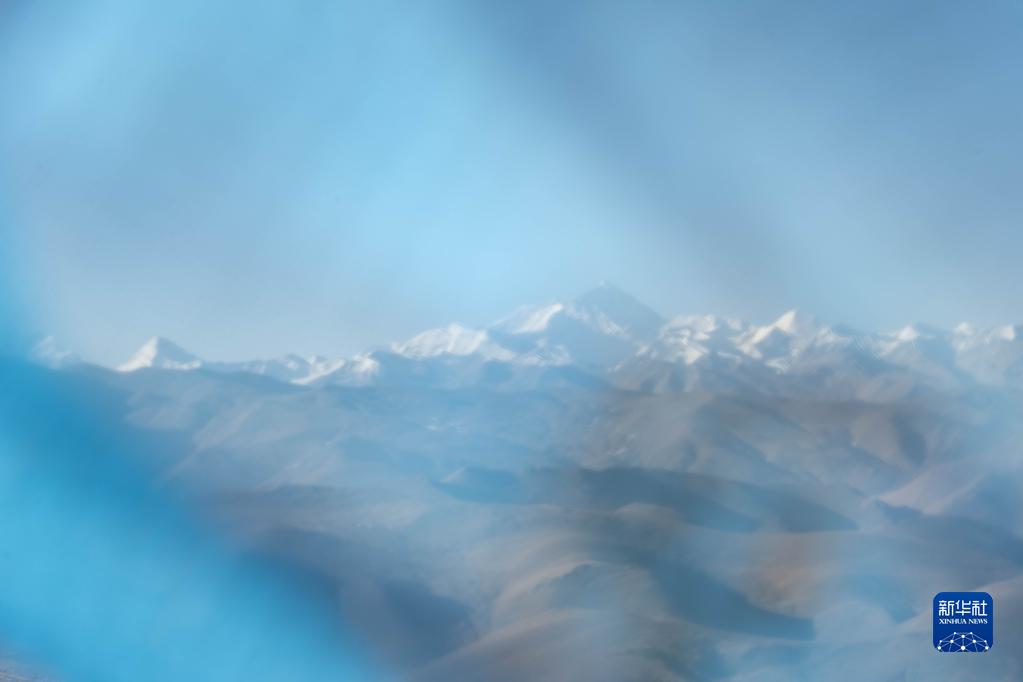 這是3月15日在西藏日喀則透過(guò)藍(lán)色經(jīng)幡拍攝的珠穆朗瑪峰。新華社記者 周荻瀟 攝