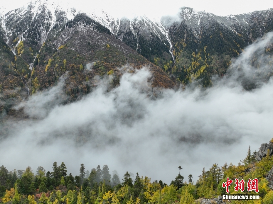 10月26日,航拍西藏多雄拉雪山,雪山與層林盡染的森林組成一幅壯美的秋日高原畫卷。西藏林芝多雄拉雪山位于喜馬拉雅山脈北段主脊,曾是徒步進(jìn)入墨脫縣最艱險的路段之一。(無人機照片) 中新社發(fā) 董志雄 攝