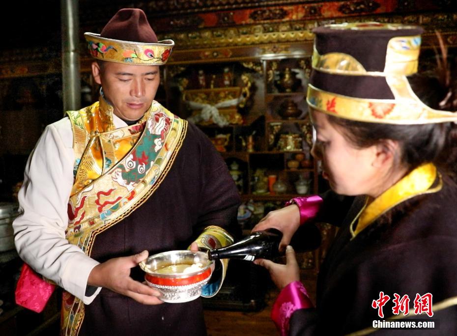 11月24日恰逢藏歷十月初一,西藏林芝迎來2023年工布新年,這是西藏最早的新年。工布新年以其悠久的歷史、鮮明的特色、豐富的內(nèi)涵,于2006年被列入第一批西藏自治區(qū)非物質文化遺產(chǎn)保護名錄。圖為村民向客人敬酒。 阿仁 攝
