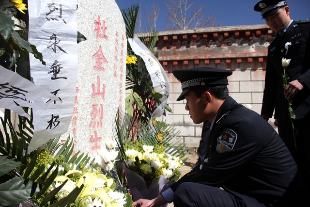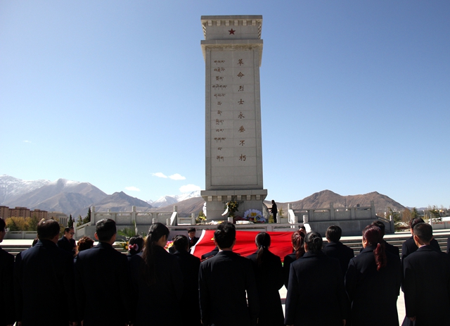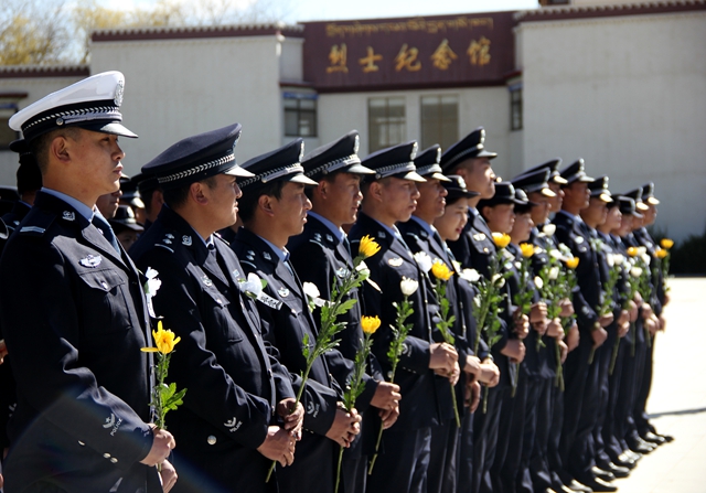 緬懷革命先烈,傳承革命精神?!拔覀儾荒芡洖闋幦∶褡褰夥藕腿嗣裥腋6I(xiàn)身的烈士。他們拋頭顱、灑熱血換來了我們今天的幸福生活,他們是人民心中永恒的豐碑。”在現(xiàn)場的拉薩市公安局張警官說。