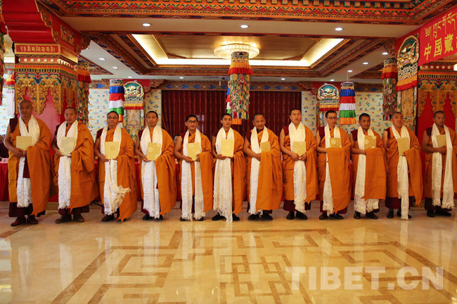 圖為12位格魯派高級(jí)學(xué)銜獲得者在學(xué)銜授予儀式現(xiàn)場(chǎng)合影留念。