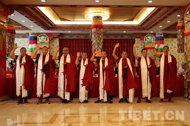 圖為8位薩迦派高級(jí)學(xué)銜獲得者進(jìn)行傳統(tǒng)的“三聲歡呼”儀軌。藏傳佛教新型學(xué)銜制度于2004年建立實(shí)施,包括“拓然巴”“智然巴”“禪然巴”三級(jí),截至目前,已授予168名僧人“拓然巴”高級(jí)學(xué)銜。