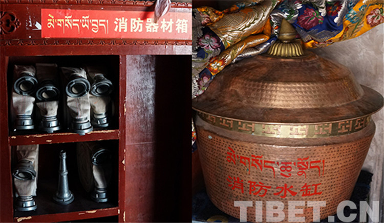 圖為強巴林寺的消防器材箱和消防水缸,每個樓殿里都配備齊全。攝影:楊悅笙