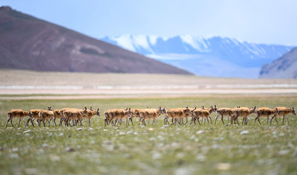 圖為在羌塘國家級自然保護(hù)區(qū)內(nèi),一群母藏羚羊遷徙前往產(chǎn)仔地。攝影:邊巴次仁
