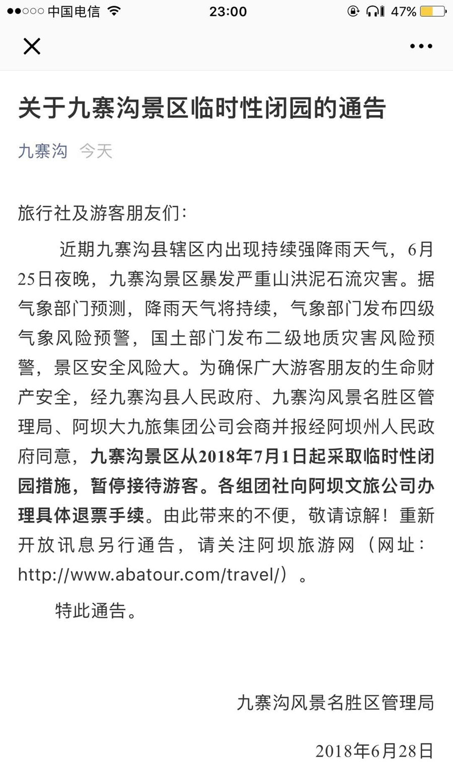 中國西藏網(wǎng)訊 6月28日晚,九寨溝風(fēng)景名勝區(qū)管理局在其官微發(fā)布題為《關(guān)于九寨溝景區(qū)臨時性閉園的通告》稱,因天氣原因造成景區(qū)風(fēng)險大,九寨溝景區(qū)從2018年7月1日起采取臨時性閉園措施,暫停接待游客。